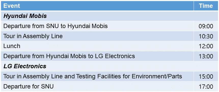 Our bus must leave the SNU campus from Building 38 at 9:00AM without any delay due to the tight schedule.