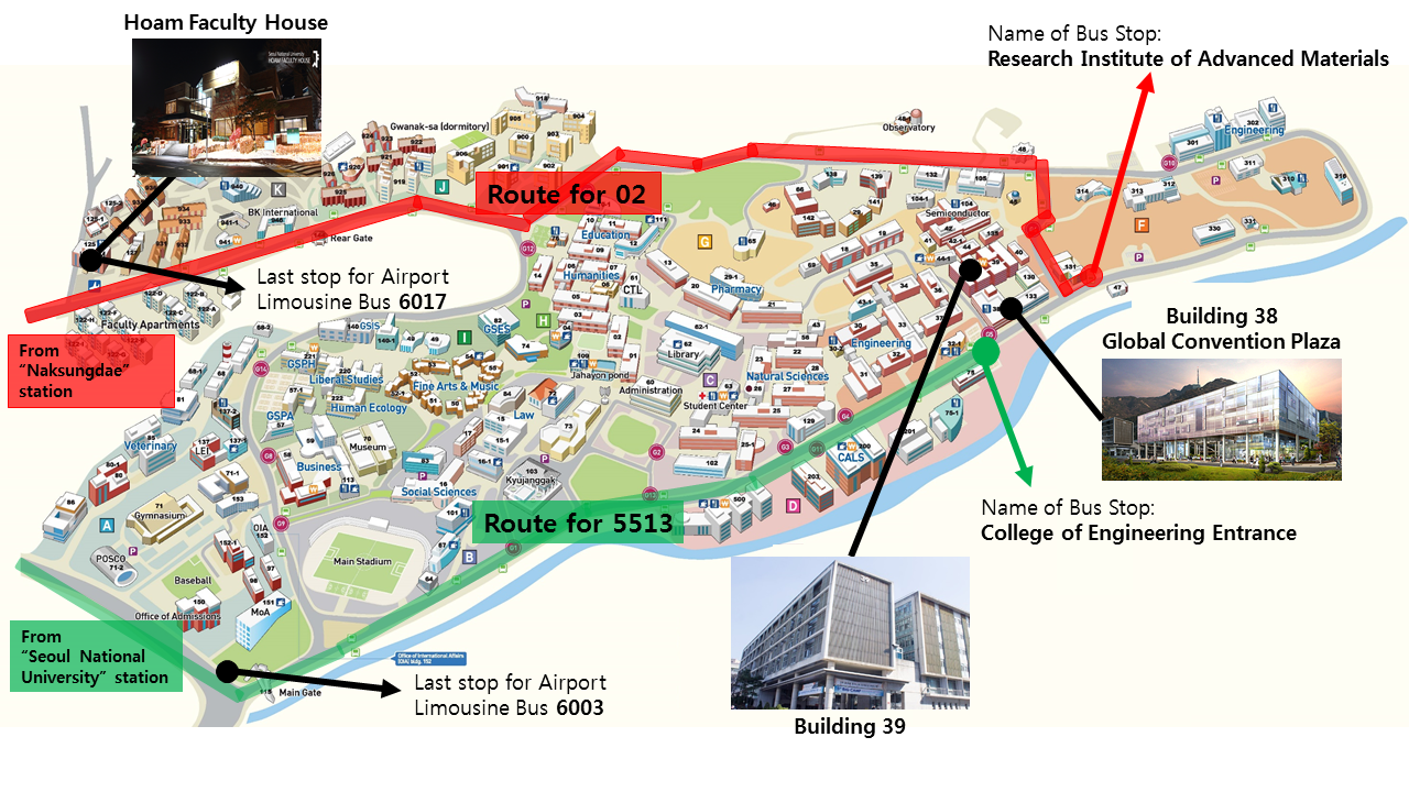 You have to get to the subway station named as “Naksungdae”. You need to get out of Exit 4 and take a green bus numbered as “02”. The destination bus stop on SNU campus is called “Research Institute of Advanced Materials”. You may choose a taxi from Exit 4 of “Naksungdae” station for around 5 dollars. (See the blue route on the campus map).