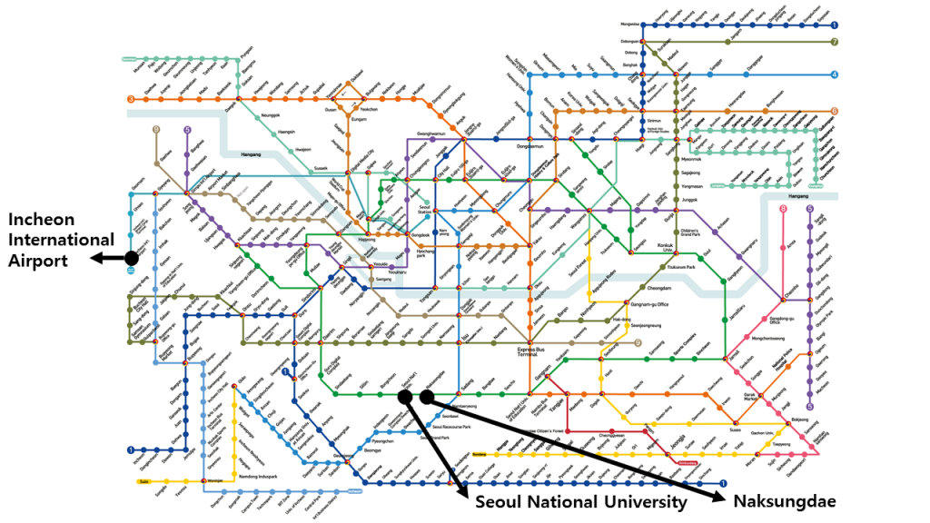To reach the conference venue named as “Global Convention Plaza” (Building No. 38) on Seoul National University campus, please make sure to take Subway Line No. 2 (Green Line) and stop either at “Seoul National University” station or “Naksungdae” station. These stations are located on the following Seoul Metro Subway map: